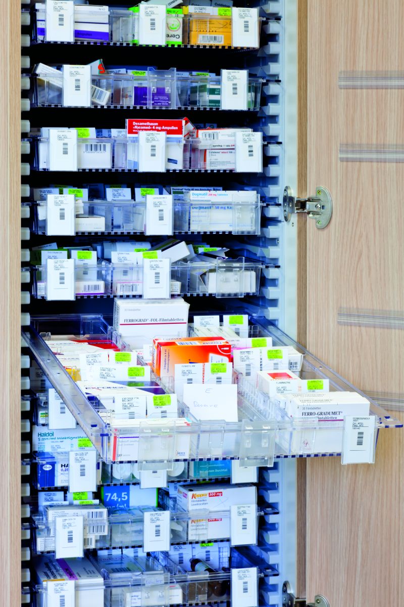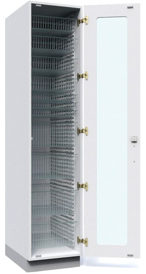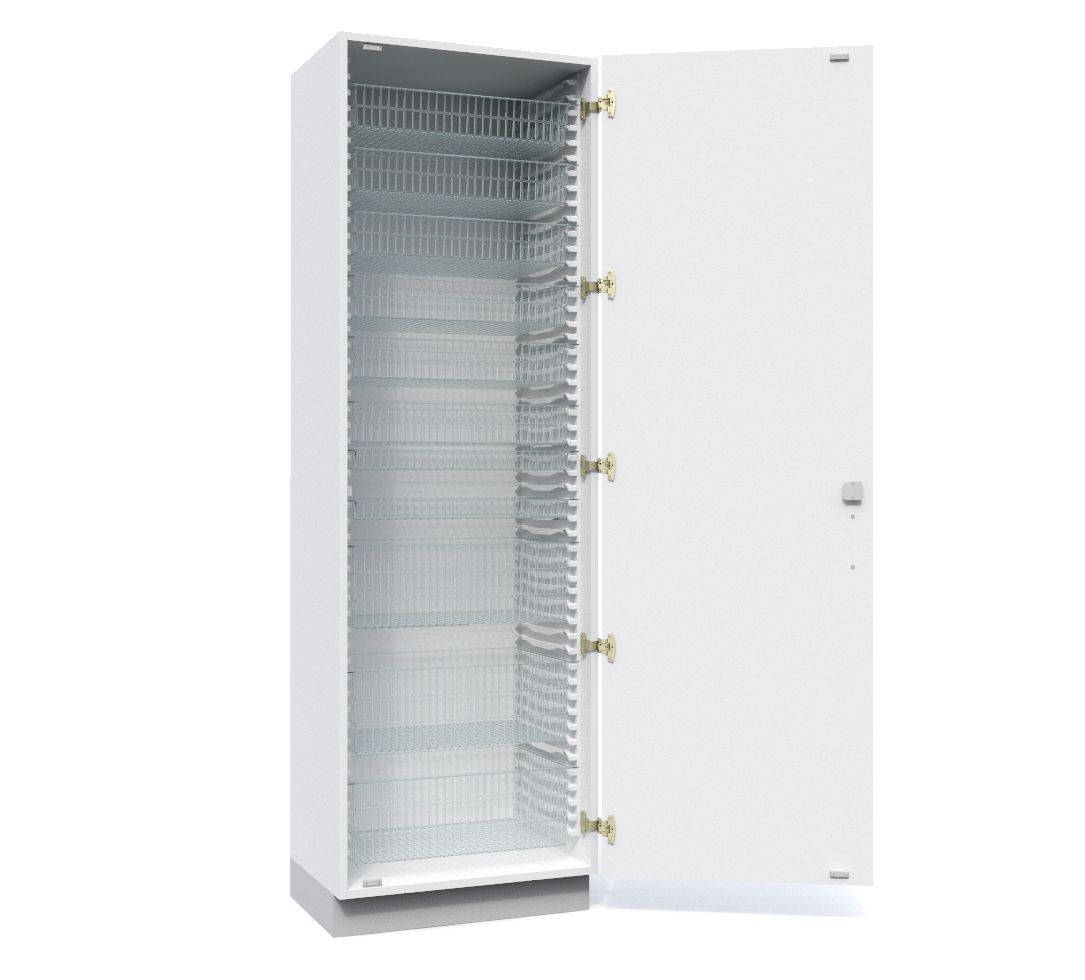 Merianto Medical hospital furniture is based on an ISO modular system using 600 x 400 mm and 400 x 300 mm baskets with the cabinet dimensions taking into consideration the modular system dimensions. The tall MK cabinets are designed for baskets with a width of 600 mm or 400 mm. The cabinet interior can be fitted as desired using ISO modular system baskets, shelves and drawer systems.