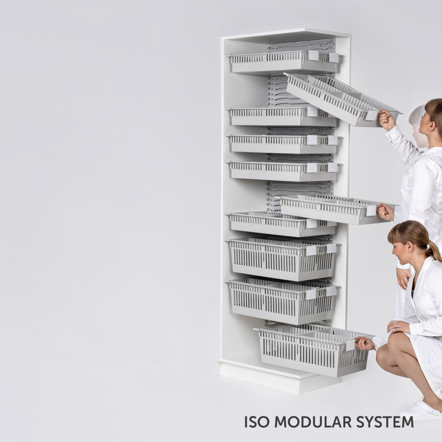 Medicinal products can be kept tidy in the baskets of the ISO modular system by using dividers, which helps prevent errors involving medicinal products and saves shelf space of up to 60% compared to conventional cabinets.