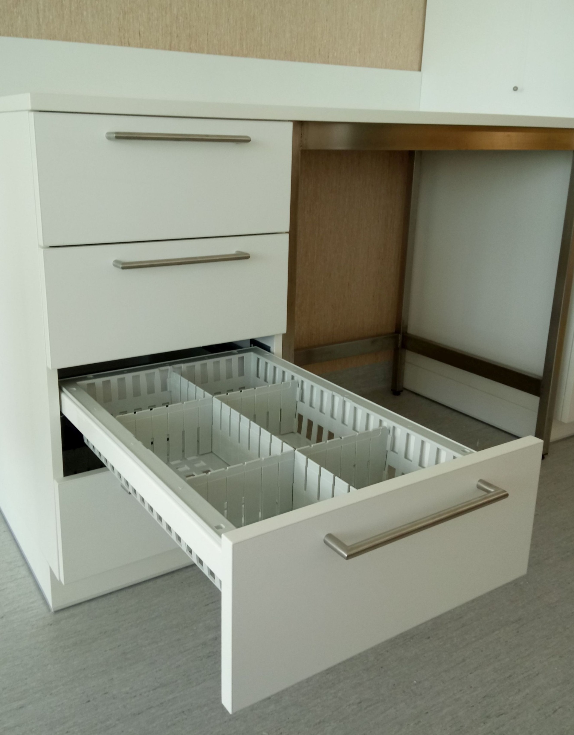 Lääkekaapit on valmistettu laadukkaasta melamiinista. Materiaalivalikoimassa on myös antibakteerinen pintaviimeistely. Kaapin etupuoli voi olla avoin tai suljettu. Ovet avautuvat 220 °, laatikot avautuvat 100 %.