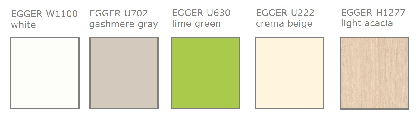 Niiden lisäksi on mahdollista valita melamiinivalmistajien katalogien kymmenistä eri väreistä ja viimeistelyistä, joiden saatavuus on tarkennettava tilattaessa.