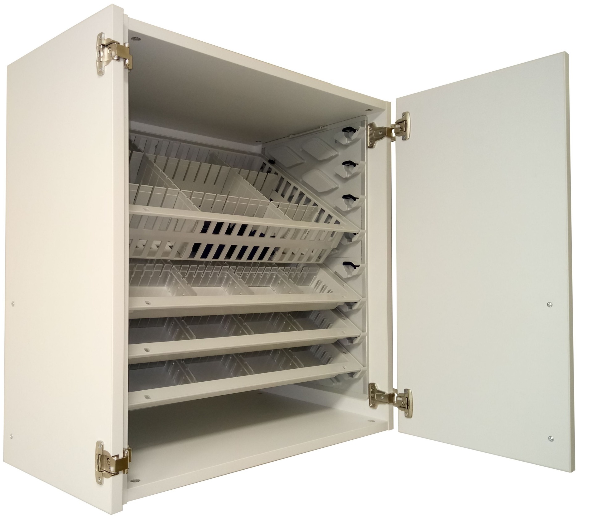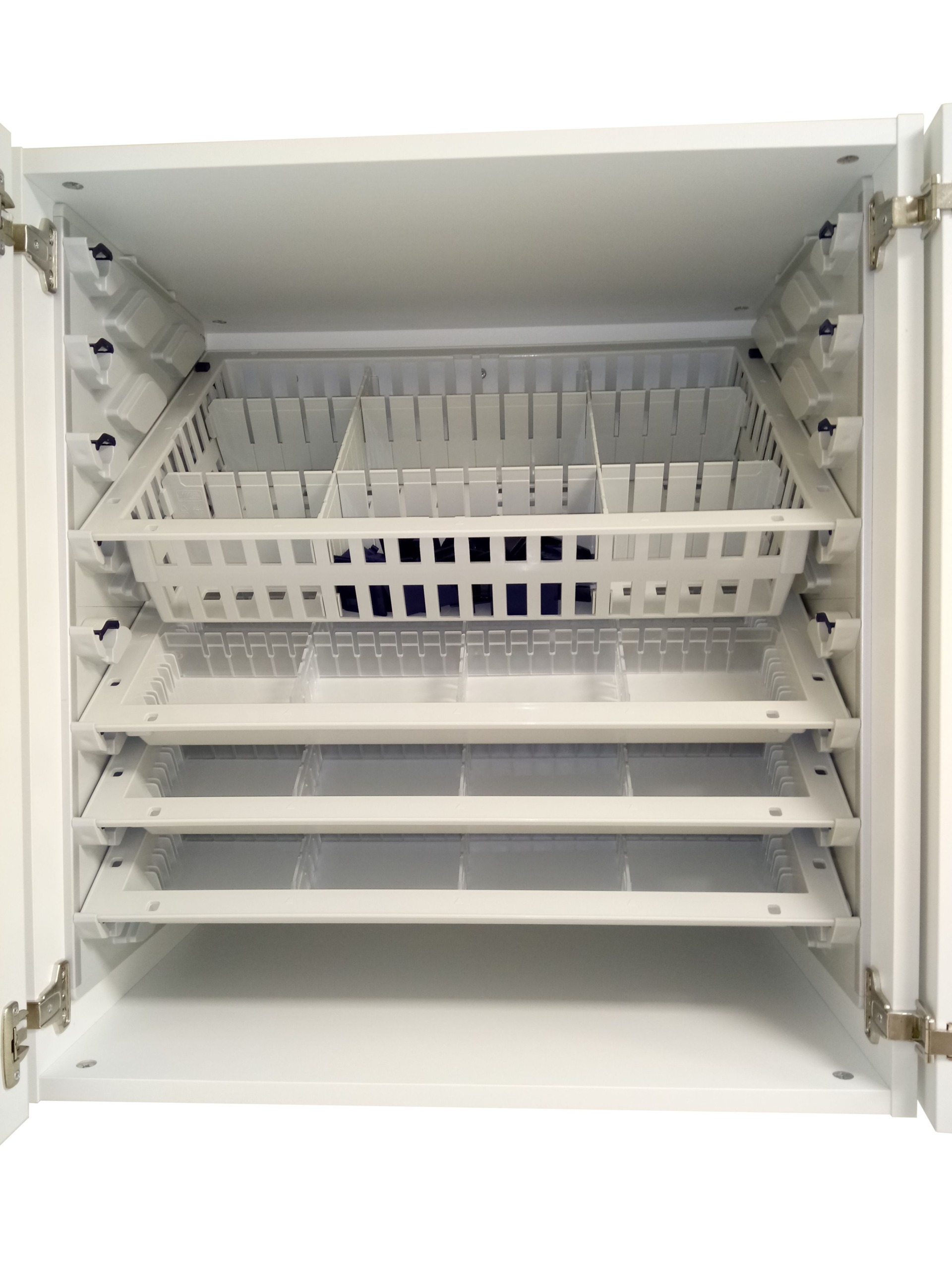 Lääkekaapit on valmistettu laadukkaasta melamiinista. Materiaalivalikoimassa on myös antibakteerinen pintaviimeistely. Kaapin etupuoli voi olla avoin tai suljettu. Ovet avautuvat 220 °.
