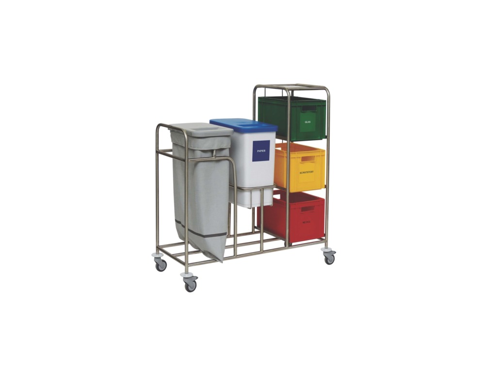 Waste trolley. Recyclable containers made of steel, stainless steel, or aluminum are equipped with either a pedal mechanism or a pull-out system. Thanks to their ergonomic and practical design, they are suitable for placement in all areas—waiting rooms, patient rooms, and staff zones